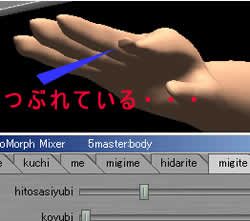 SHINYAさんのページにかわいらしいうさぎさんがいて、私は大ファンなんですが、そこのMAKINGにあげられている手のモーフがとてもすばらしいです。はじめばボーンでしてあるのかとおもっていました。形状であそこまでできればいいなと思いまして、自分も挑戦してみました。でもなかなかむずかしいです。