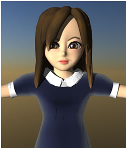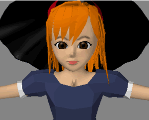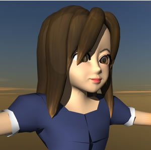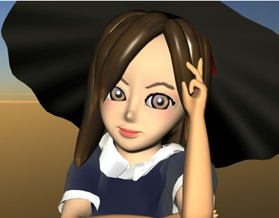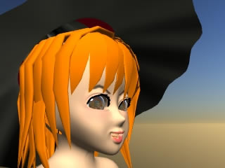ええ、上のではあんまり髪がうすっぺらいので、ボリュームをつけてみました。円柱をつくって両端をウェルド。メタフォームかけたものでUVをつくっておき、テクスチャを貼ってからぐにゃぐにゃまげました。