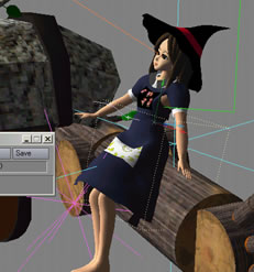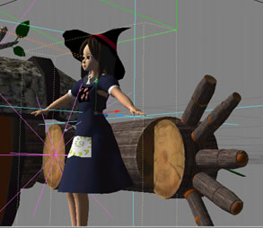 斜め上からうでめがけてたたきつけるのです。そしたらスカートはどうにもしようがありません。ということで、ななめ上からです。今のところ、うまいぐあいに木男の手のところでスカートが広がっています。