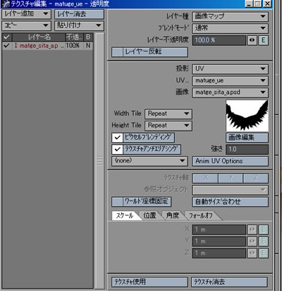 ・・で、透明度のテクスチャに、さきほどのぎざぎざの白黒の変換したものを読み込みます。黒い部分だけが透明にならず、白い部分だけが透明になるので、まつげの黒い部分だけを切り取ることができます。